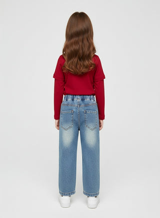 Red Bow Top With Patched Denim Jeans Set