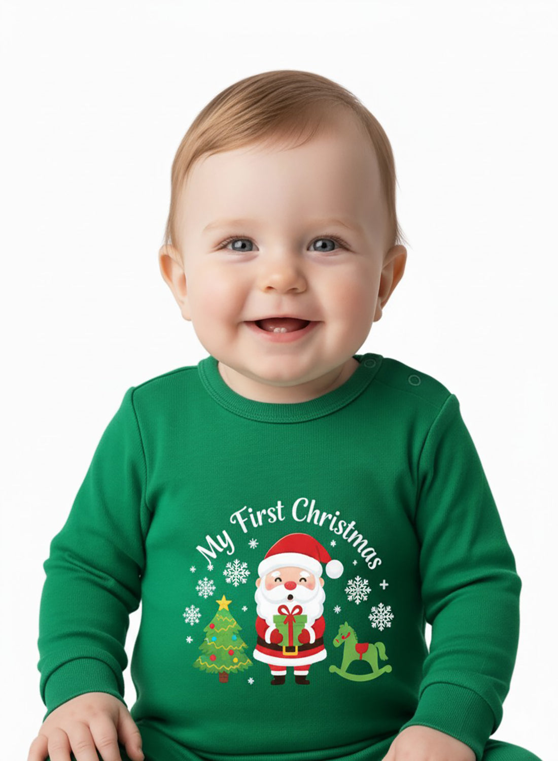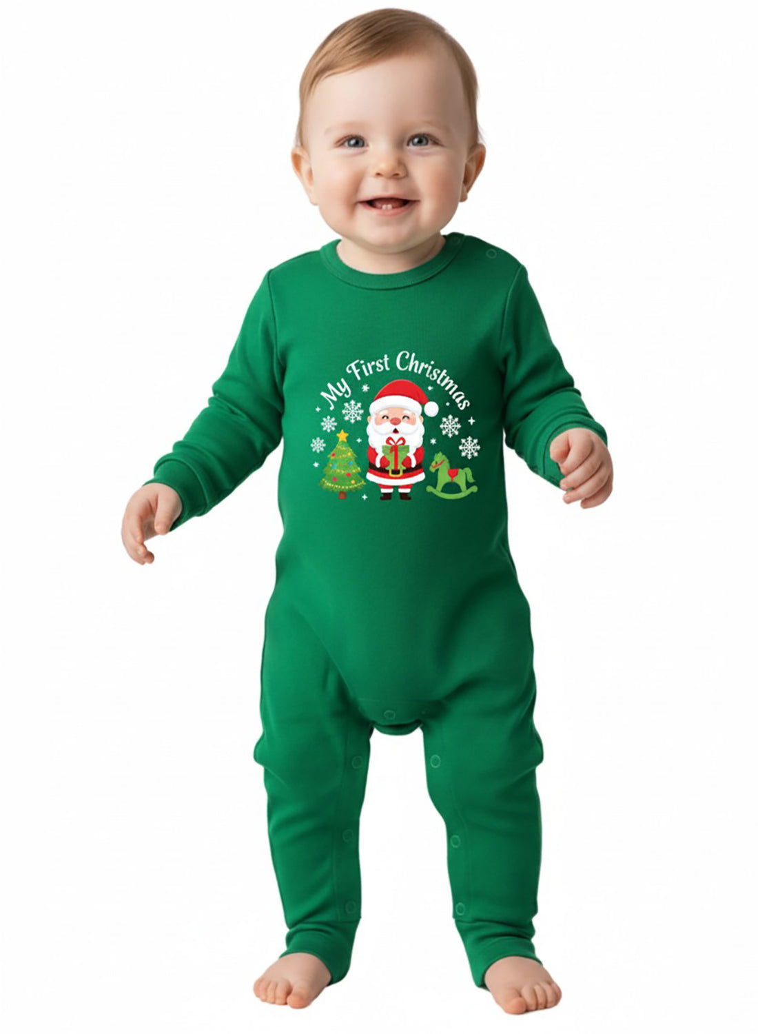 Celebrate your baby’s very first Christmas with this adorable romper adorned with Santa, gifts, and a Christmas tree. The festive design and comfy green fabric make it perfect for joyful family photos and cozy holiday mornings.