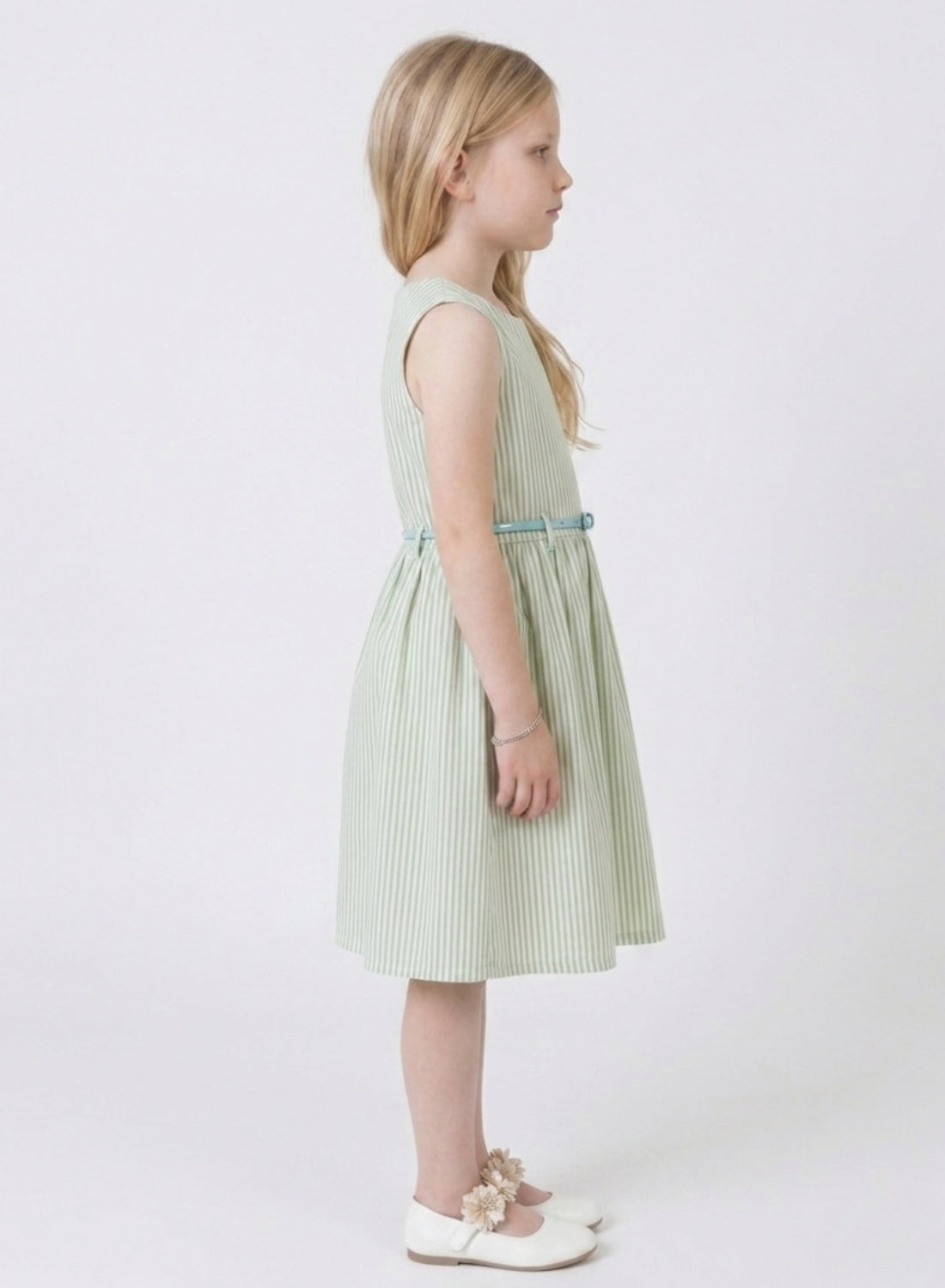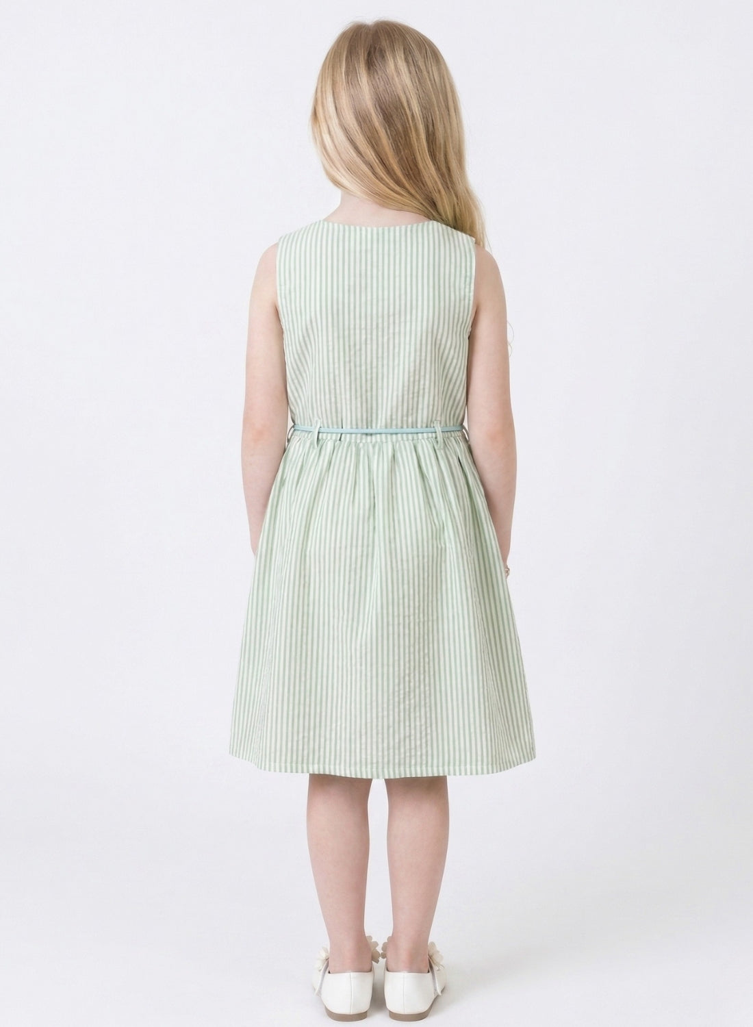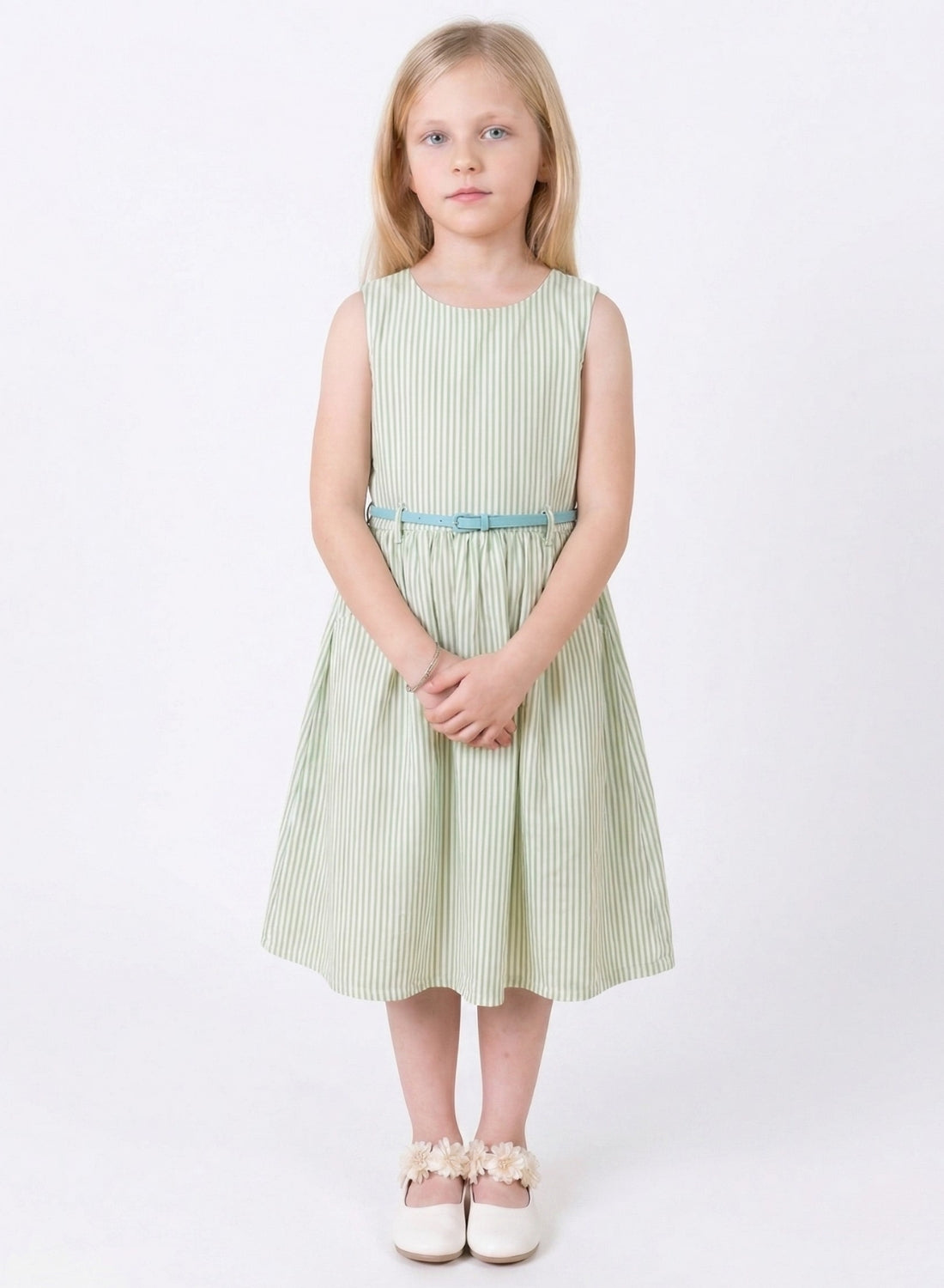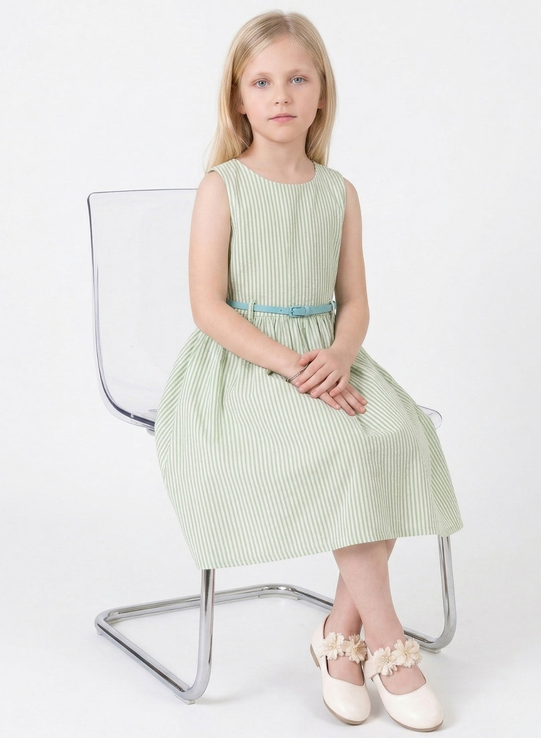 This elegant sleeveless dress features a soft green base with subtle vertical stripes, creating a fresh and timeless look for your little girl. The fitted bodice is enhanced with a delicate blue belt that adds a gentle contrast and defines the waist beautifully. The softly flared skirt offers a graceful silhouette, while the lightweight, breathable fabric ensures all-day comfort and ease of movement—perfect for both everyday wear and special occasions.