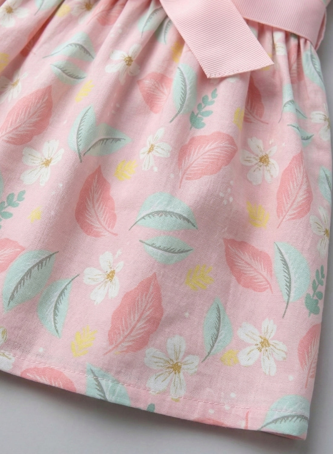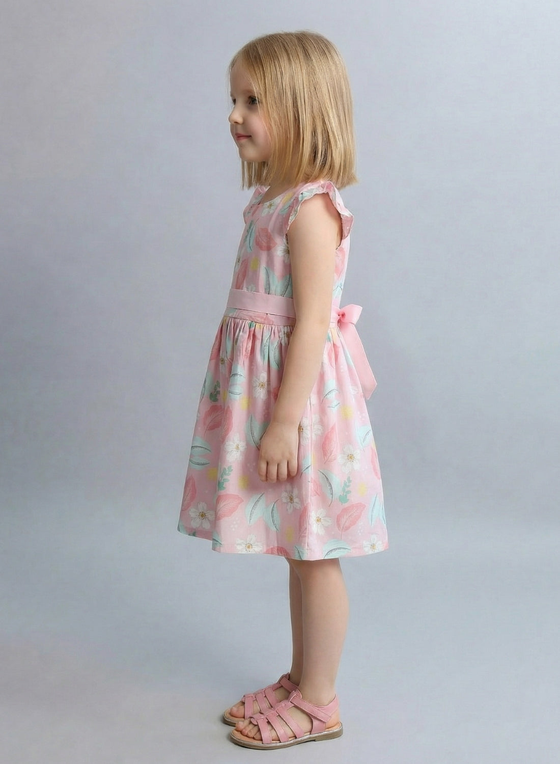 This adorable dress features a soft pink base with playful leaf and floral prints in pastel tones, giving it a fun and lively look. The flutter sleeves add a cute and feminine touch, while the fitted waist and flared skirt create a flattering silhouette. Designed with breathable fabric for all-day comfort, it’s perfect for casual outings and festive occasions.